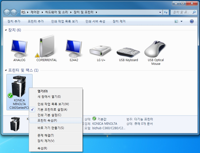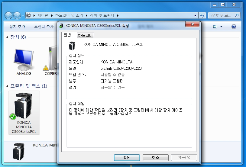 컴퓨터의 장치 및 프린터에서 코니카미놀타 bizhub C360/C280/C220